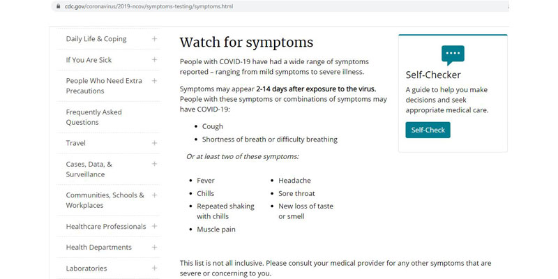 মার্কিন স্বাস্থ্য সংস্থা ‘সিডিসি’ বিশ্বব্যাপী বিভিন্ন রোগের বিষয়ে গবেষণা এবং নজরদারি চালায়। ‘সিডিসি’-এর তথ্য অনুযায়ী, নোভেল করোনা ভাইরাসের উপসর্গগুলি হল কাশি, শ্বাসকষ্ট, জ্বর, পেশীর ব্যথা, মাথা যন্ত্রণা, গলা ব্যথা ছাড়াও শরীর ঠান্ডা হয়ে যাওয়া, শীতের সঙ্গে কাঁপুনি এবং স্বাদ ও ঘ্রাণশক্তি নষ্ট হওয়া।