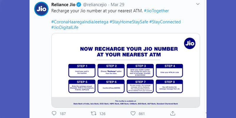করোনার মোকাবিলায় দেশ জুড়ে জারি রয়েছে লকডাউন। বর্তমানে নিত্য প্রয়োজনীয় সামগ্রী যেমন মুদি, বাজার-হাট, ব্যাংক এবং হাসপাতালের মত জরুরী পরিষেবা ছাড়া সবকিছুই বন্ধ। আর সবথেকে বড় বিষয় হল, এই সকল জরুরী কারণ ছাড়া বাড়ির বাইরে যাওয়াও নিষেধ। এমন পরিস্থিতিতে যারা অনলাইনে মোবাইল রিচার্জ করতে অভ্যস্ত নন বা পারেন না, তারা ইতিমধ্যেই সমস্যায় পড়েছেন। কারণ যারা দায়িত্ব নিয়ে মোবাইল রিচার্জ করত সেই সকল দোকানে এখন তালা পড়েছে। এই সমস্যার সমাধান করতে রিলায়েন্স জিও তার গ্রাহকদের জন্য নিয়ে এল একটি অভিনব ব্যবস্থা। এবার ব্যাংকের এটিএম থেকেই মোবাইল রিচার্জ করা যাবে। টেলিকম কোম্পানি রিলায়েন্স জিও-এর তরফে এই কথা জানানো হয়েছে। এক্ষেত্রে যে সকল ব্যাংকের এটিএমগুলি ব্যবহার করা যাবে সেগুলির নাম দেওয়া হল-